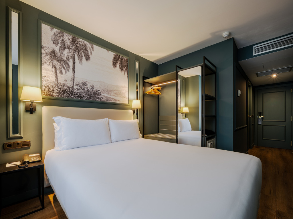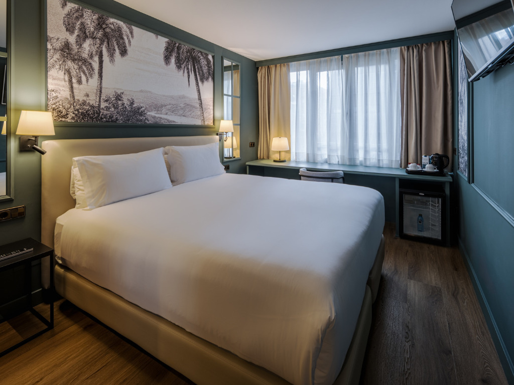 RENOVATED room equipped with two beds and a comfortable mattress. You will also find a coffee and tea set, fridge, large format LCD TV, air conditioning and parquet floor.